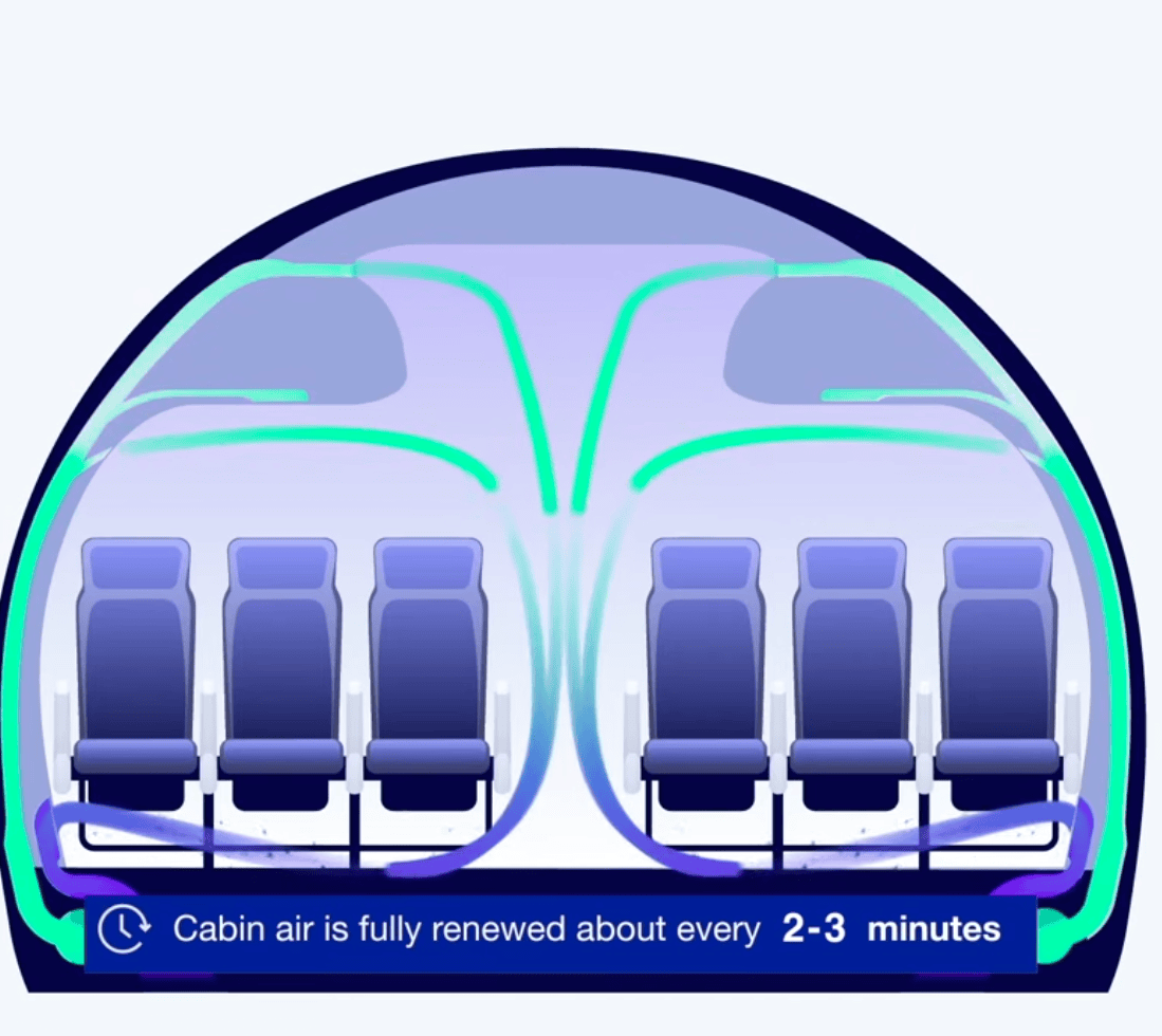 The cabin air is made of two parts. Half is fresh air from outside and the other half is recycled using efficient hospital-grade High Efficiency Particulate Air (HEPA) filters.