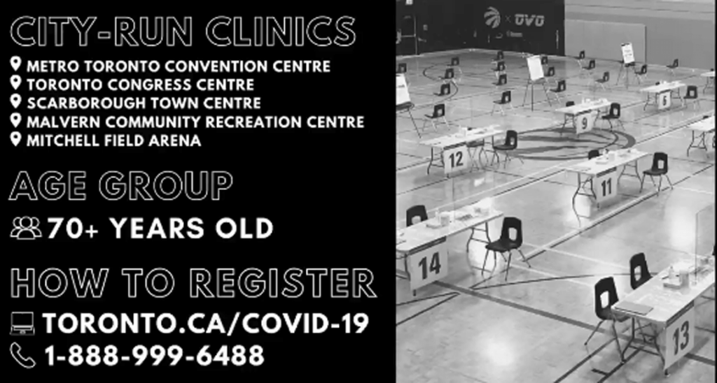 The City of Toronto just opened two more COVID-19 immunization clinics at Malvern Community Recreation Centre (Malvern) in Scarborough and Mitchell Field Arena (Willowdale) in North York to vaccinate eligible … Continue reading Toronto opens two more community vaccination clinics for seniors with appointments