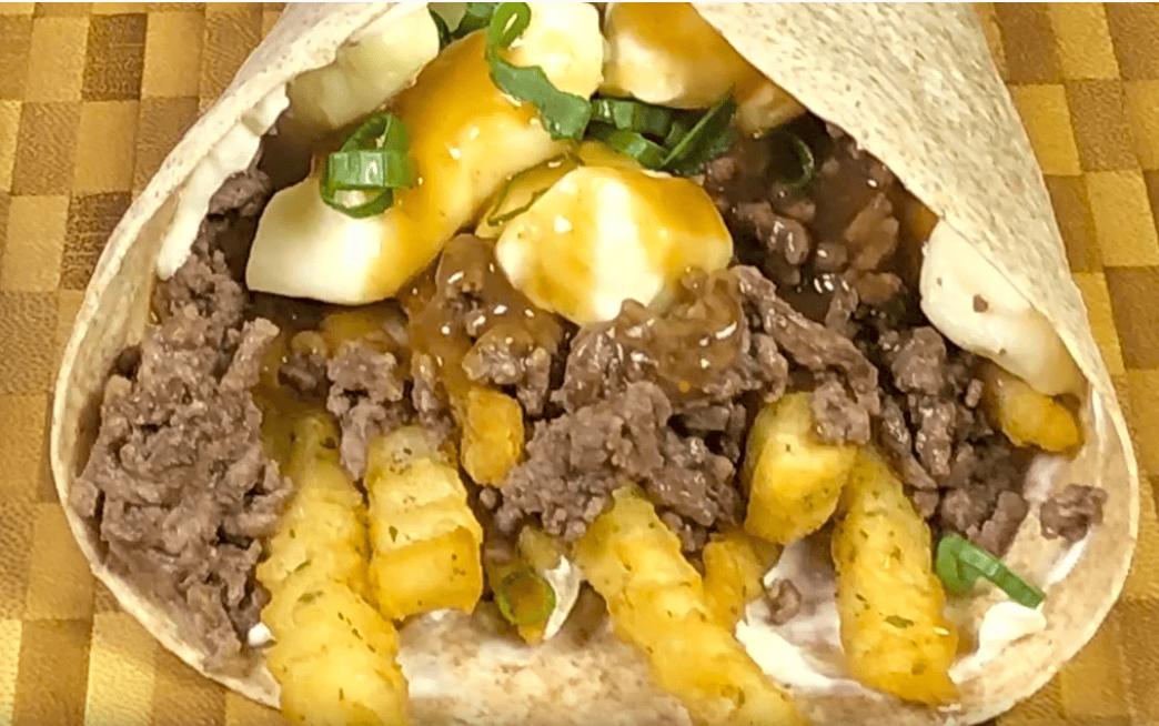 Have you ever wanted to indulge in a real tasty and filling snack? This is more than a snack; this Ground Beef topped off with Cheese Curds and Gravy over Rosemary and Garlic Fries in a wrap is filling…and did I mention delicious!