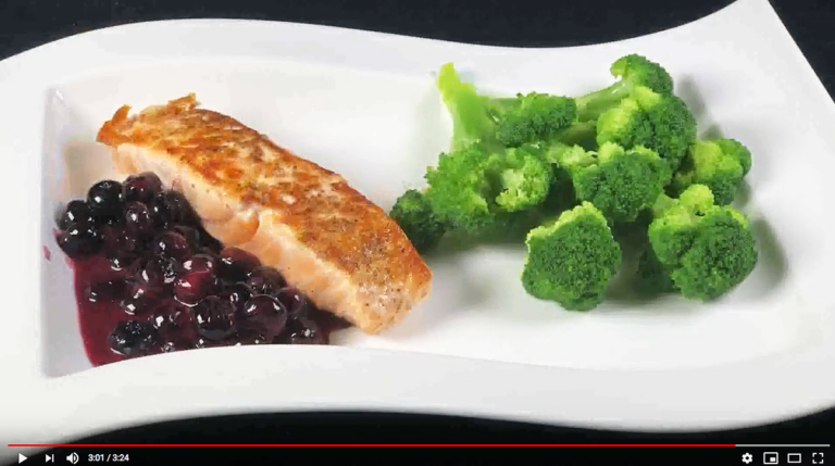 Chef’s notes: Salmon and blueberries? Yes, and with broccoli. The salmon swims nicely in a sea of blueberry sauce with a touch of lemon juice while the green broccoli forms … Continue reading Recipe: Seared salmon in a blueberry sea (watch video)
